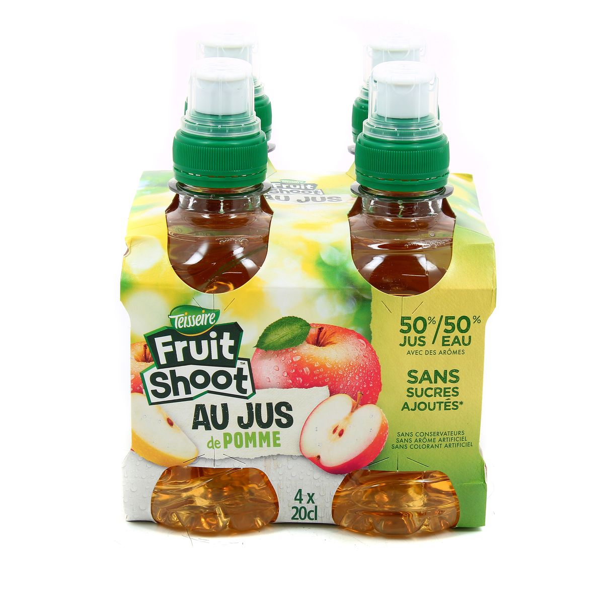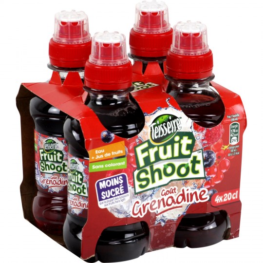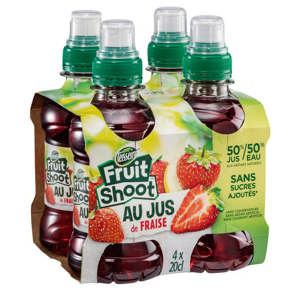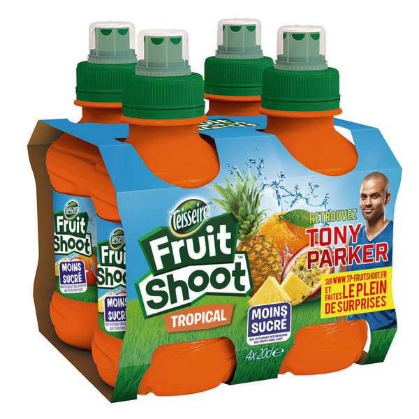 Fruit Shoot. Ingrédients : Eau (82%), jus de fruits à base de concentrés 10% (ananas 4,2%, orange 4,2%, fruit de la passion 0,4%, pomme, abricot,...