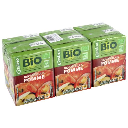 Jus de pomme issu de l'agriculture biologique. Ingrédients : Jus de Pomme* *issu de l'agriculture biologique Quantité : 6 x 20 cl Marque : Casino...