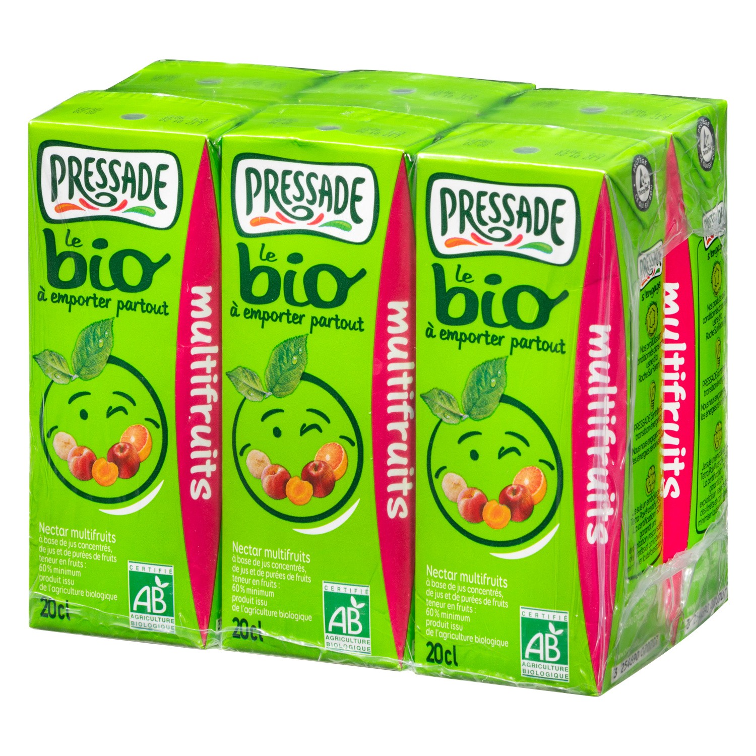 Le Bio à emporter partout Multifruits. Ingrédients : Jus de fruit à base de jus concentrés et purées de fruits [pomme* (29,5 %), orange*, abricot*...