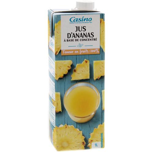 Jus d'ananas à base de jus d'ananas concentré. Ingrédients : Jus d'ananas à base de jus d'ananas concentré. Quantité : 1 l Marque : Casino...