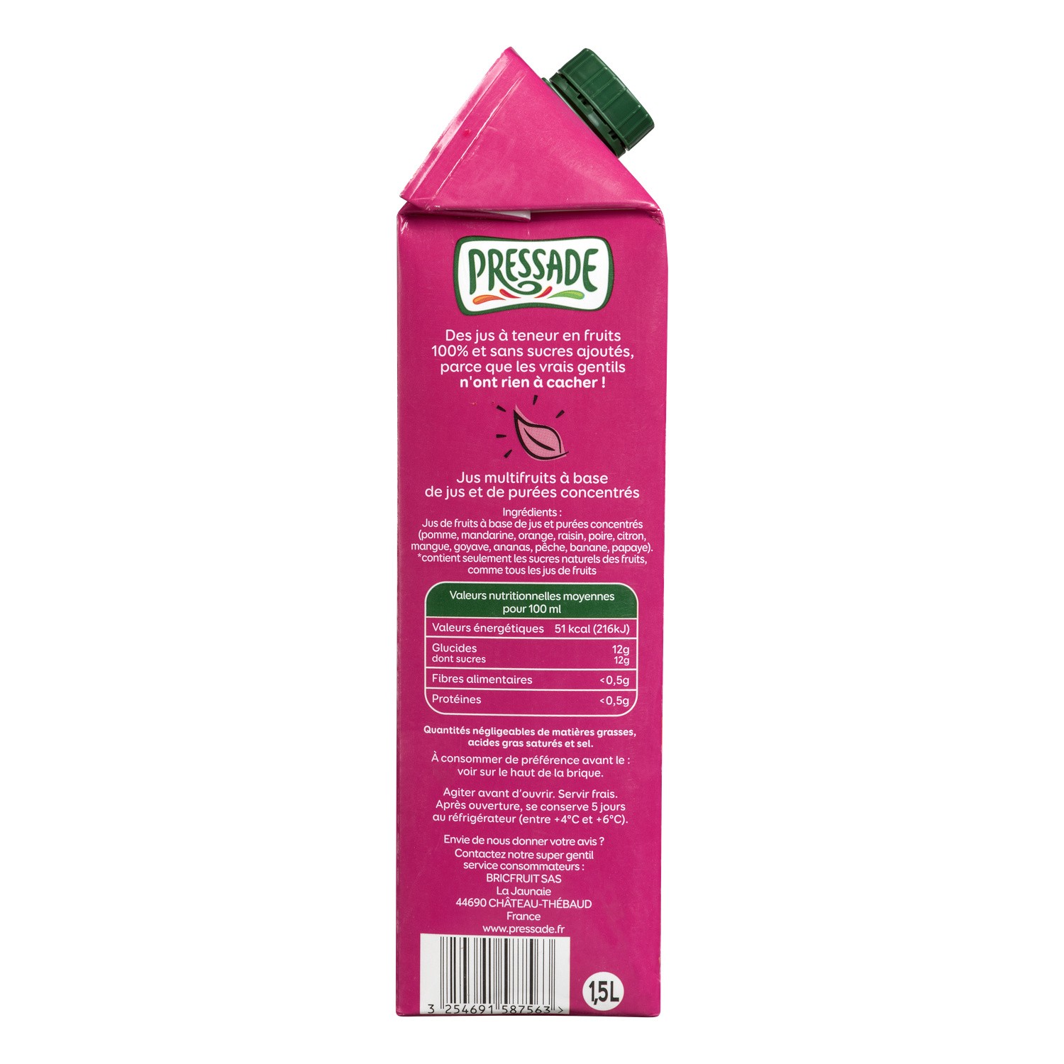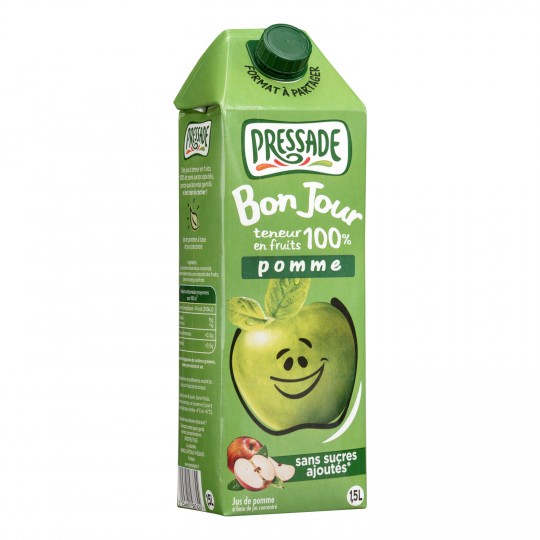 Jus de pomme sans sucres ajoutés. Ingrédients : Jus de pomme à base de jus concentré. Quantité : 1,5 L Marque : Pressade