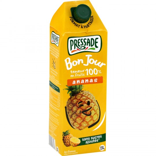 Jus d'ananas. Ingrédients : Jus d'ananas à base de jus concentré Quantité : 1.5 l Marque : Pressade