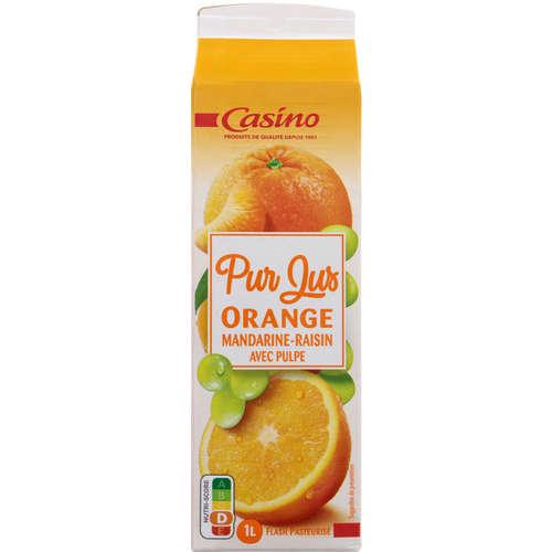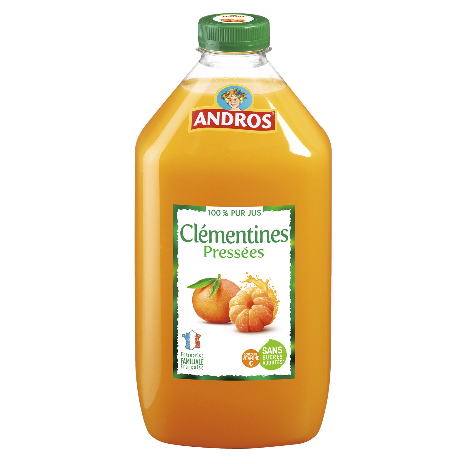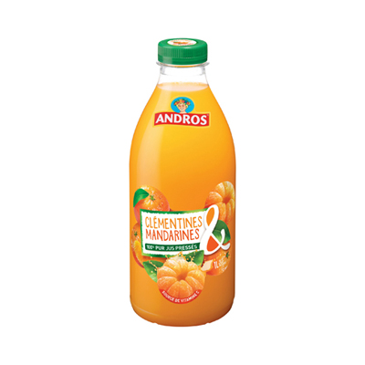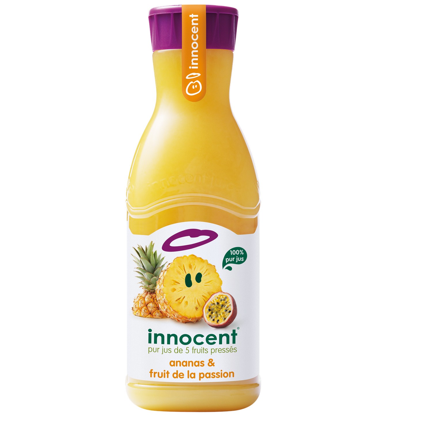 Pur jus de 5 fruits pressés. Ingrédients : 4 pommes pressées (50%), 4 oranges pressées (35%), une tranche d’ananas pressée (12%), un morceau de mangue...