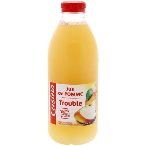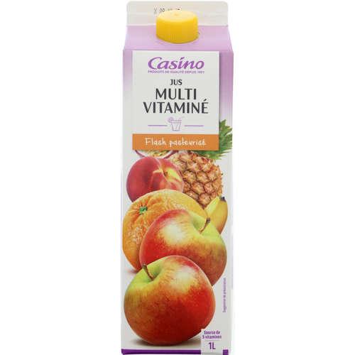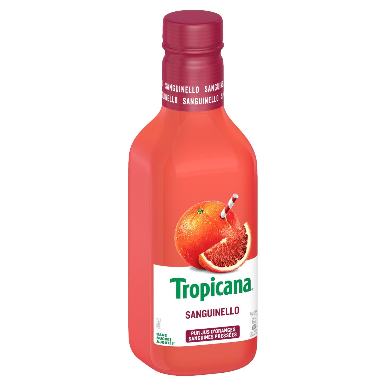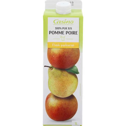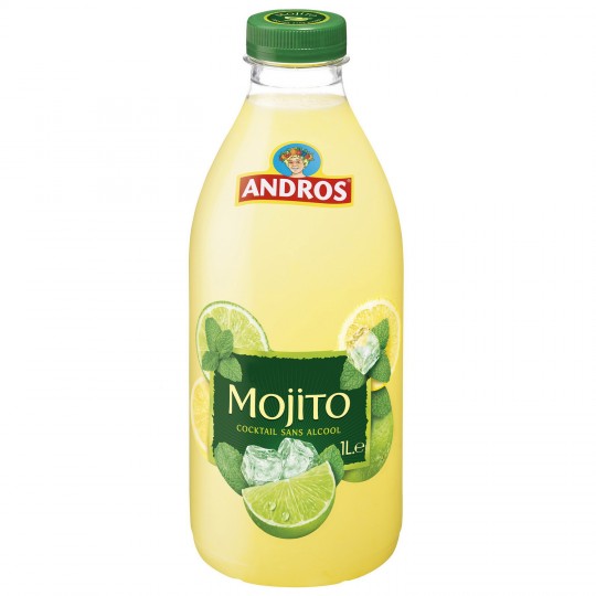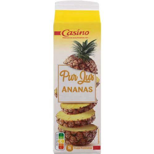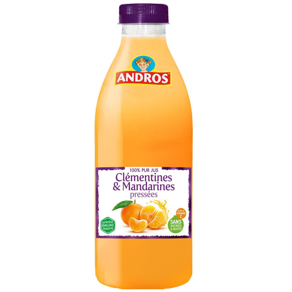 Pur jus de 5 fruits pressés. Ingrédients : 4 pommes pressées (50%), 4 oranges pressées (35%), une tranche d’ananas pressée (12%), un morceau de mangue...