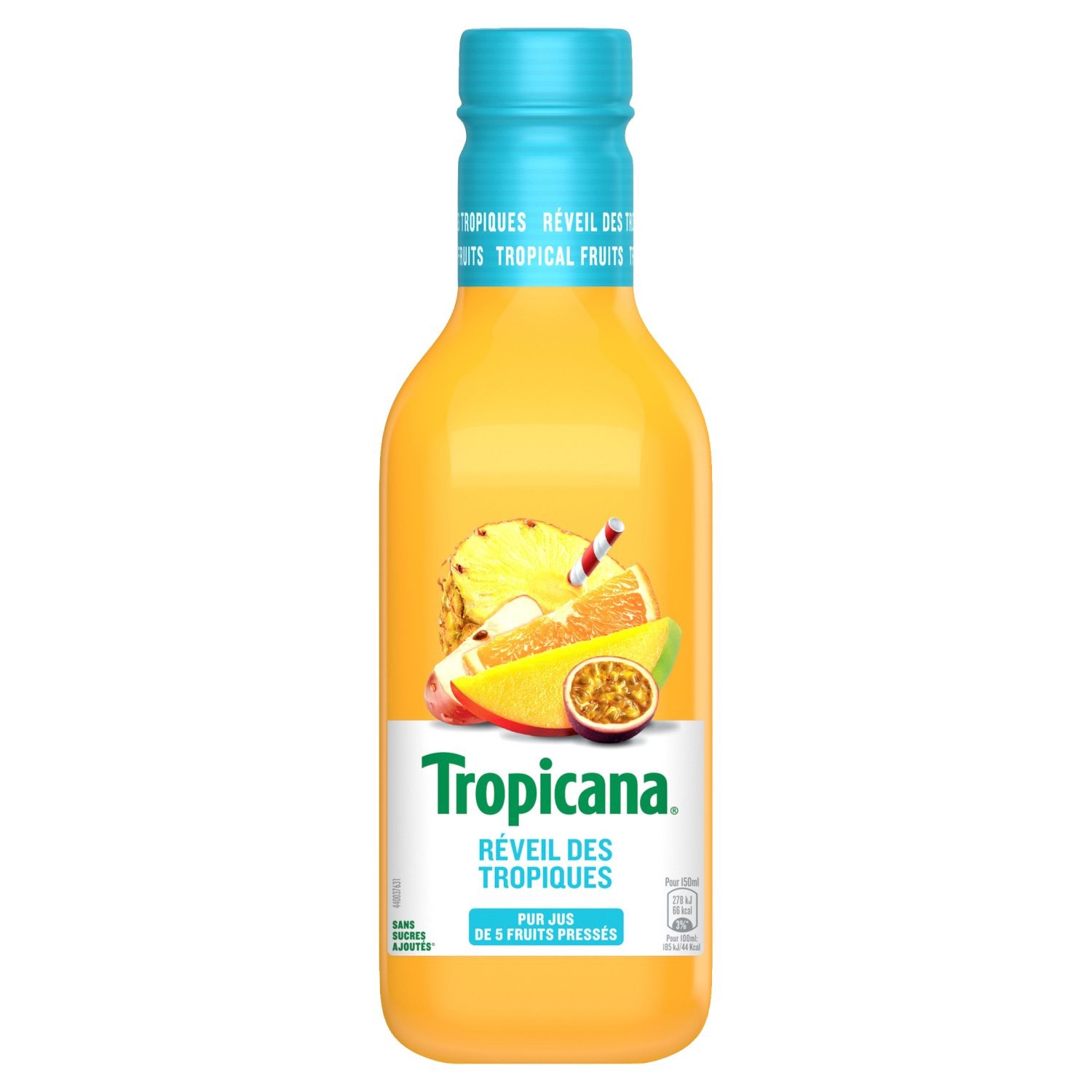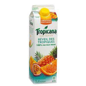Réveil des tropiques. Ingrédients : Jus d'orange, jus de pomme, jus d'ananas, jus de fruit de la passion, purée de mangue. Quantité : 1 L...