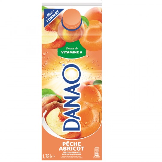 Danao Pêche abricot. Ingrédients : Eau de source, jus de fruits à base de concentré 25,6% (pêche 12,8%, abricot 12,8%), _lait_ écrémé 16,5%, sucre, stabilisant...