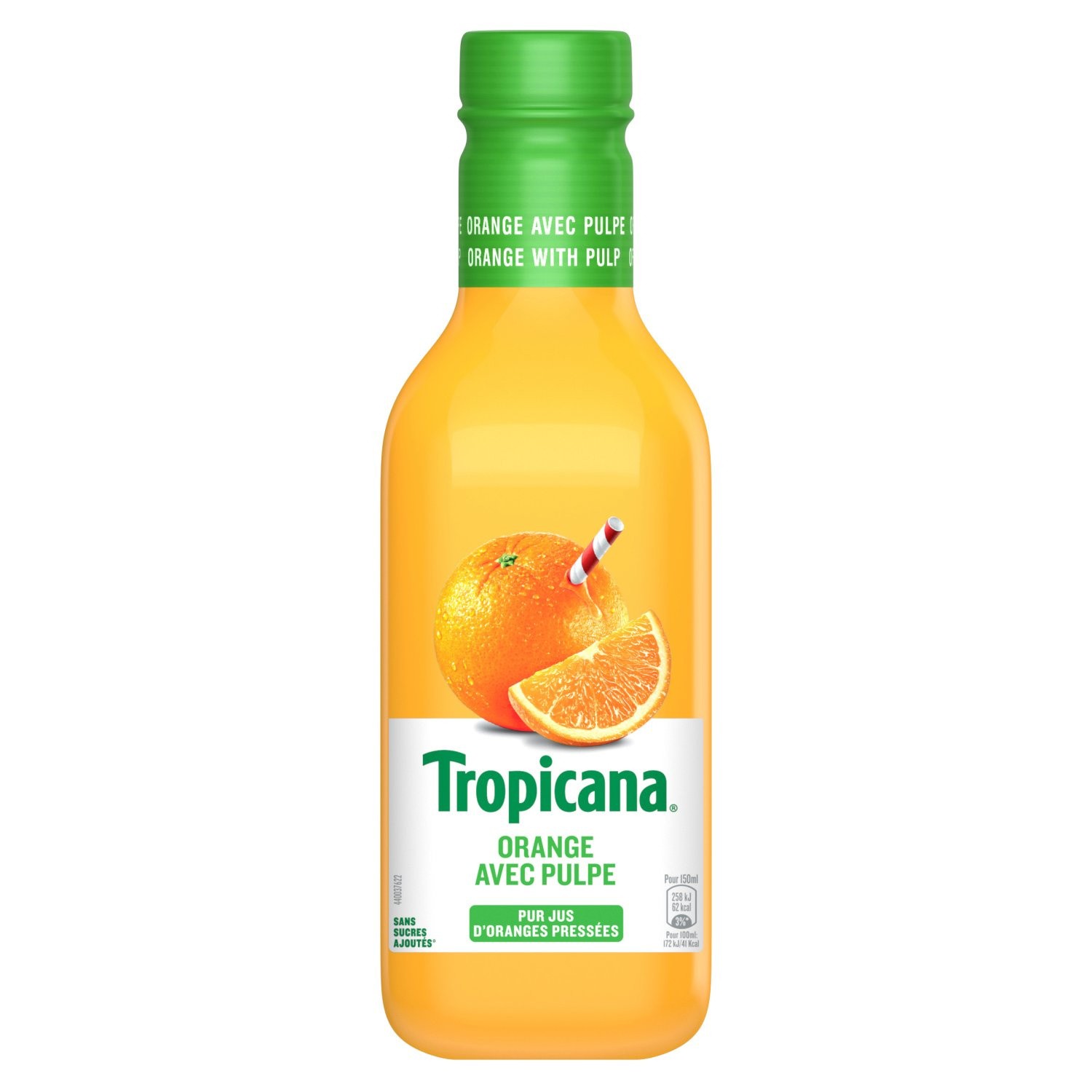 Pur jus d’oranges pressées. Ingrédients : Jus d'oranges avec pulpe Quantité : 900 ml e Marque : Tropicana