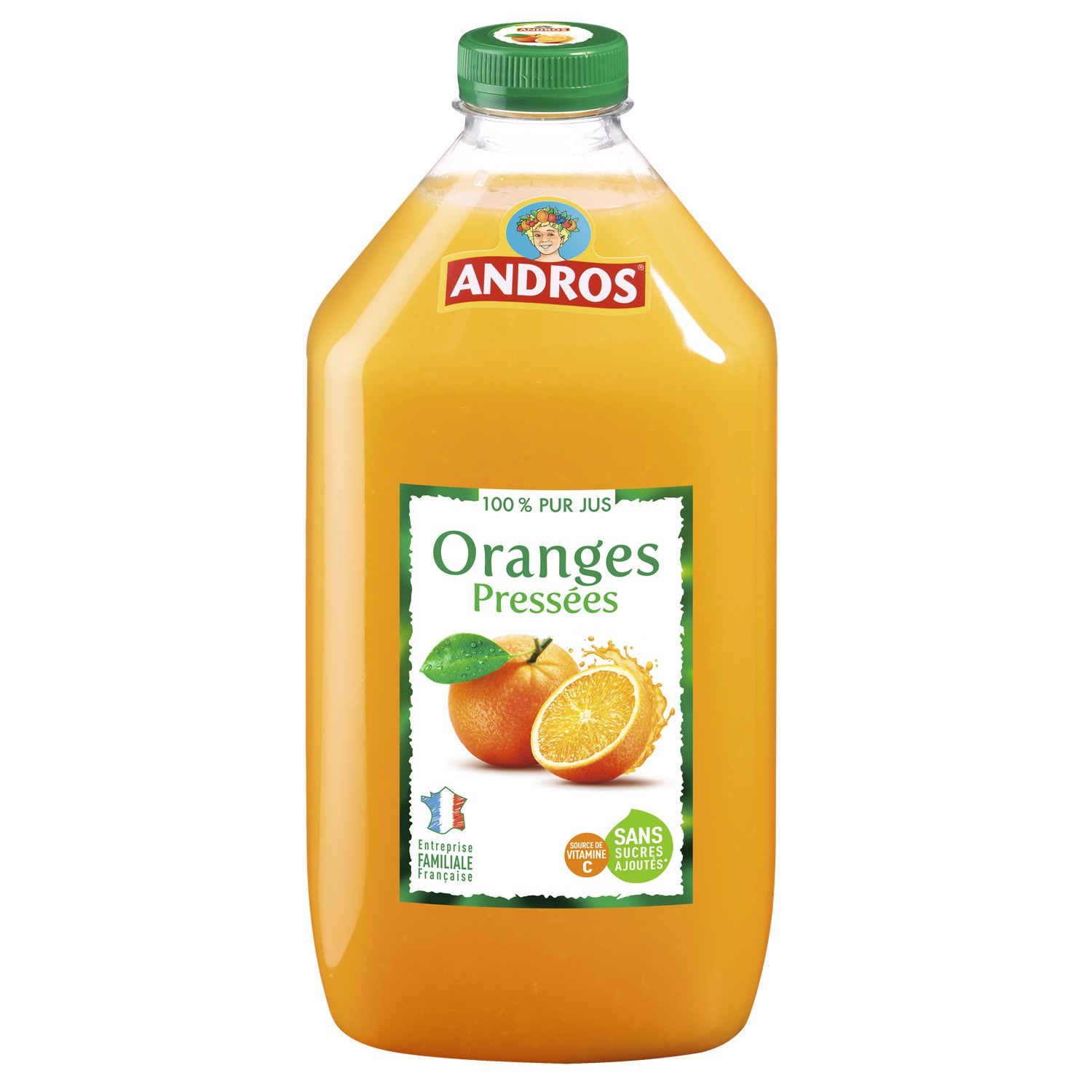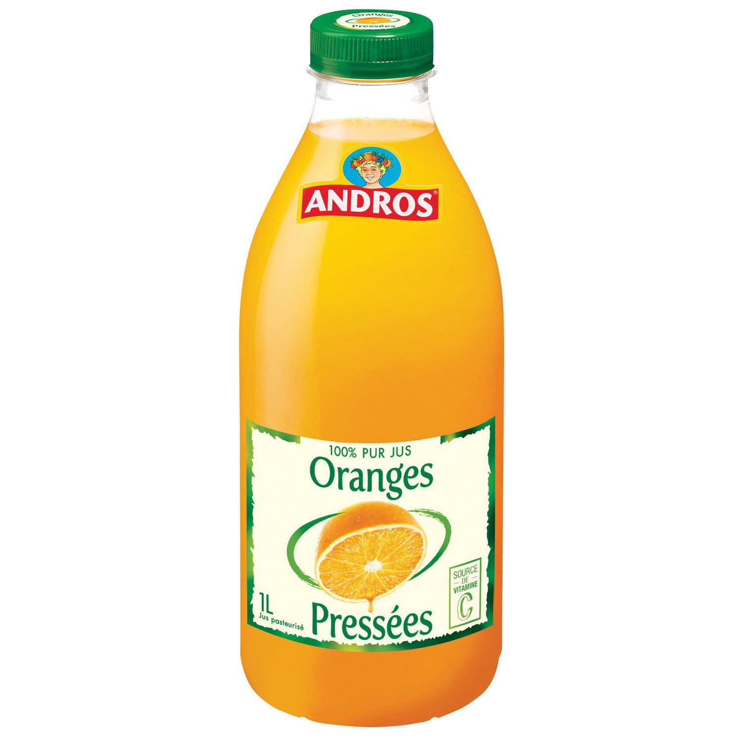 100% pur jus Oranges Pressées. Ingrédients : jus d'oranges Quantité : 1,15 L Marque : Andros