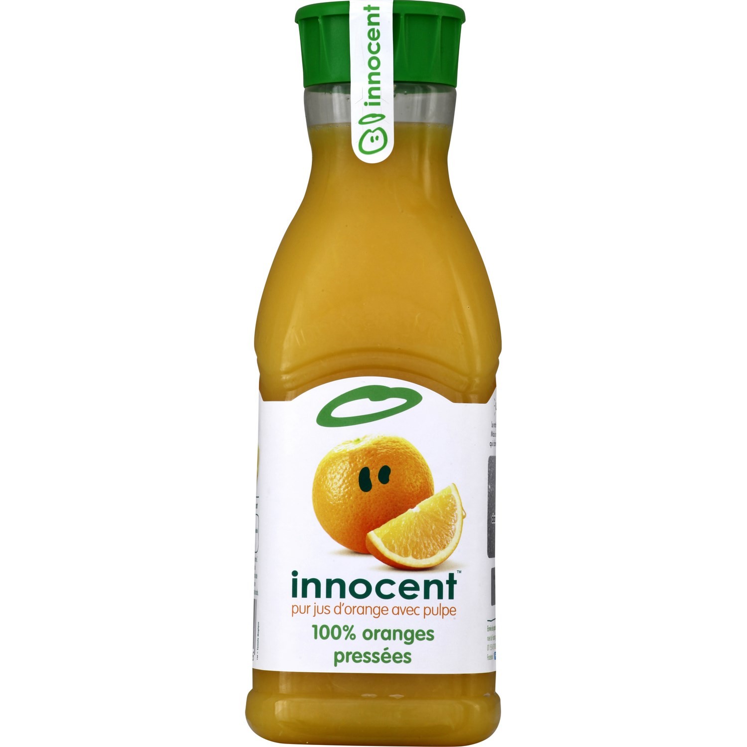 Jus d'orange. Ingrédients : 11 oranges pressées. Quantité : 900 ml Marque : Innocent
