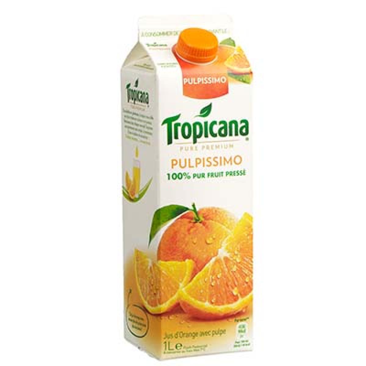 Pure Premium Pulpissimo extra pulpe. Ingrédients : Jus d'orange, pulpe d'orange. Quantité : 1 L Marque : Tropicana