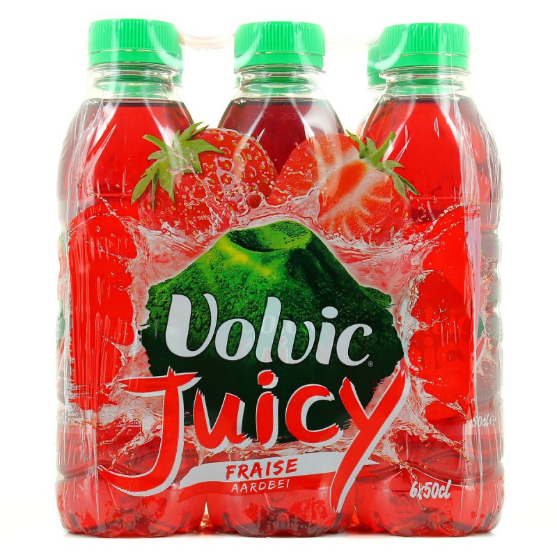 Volvic juicy fraise. Ingrédients : Eau minérale naturelle Volvic (84,3%), jus de fruits à base de concentré 10% (fraise 5%, citron 2,8%, raisin 2,2%), sucre...