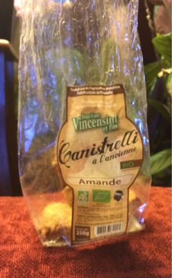 CANISTRELLI AMANDE BIO. Ingrédients : Farine de blé?, huile de tournesol?, sucre de canne roux?, amande? 14%, vin blanc?, sel de Guérande, poudre levante? :...