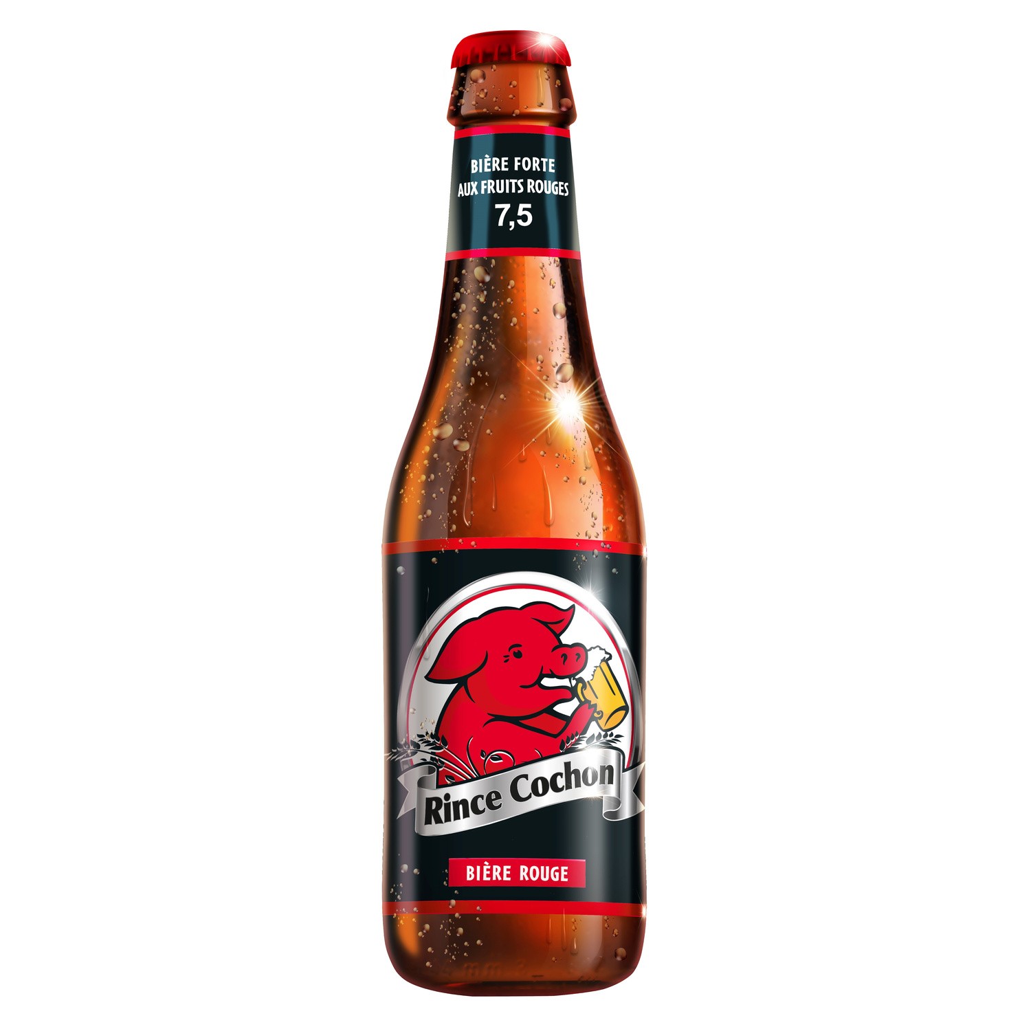 Bière forte aux fruits rouges. Ingrédients : Houblon, orge, malt, levures, pur jus de cerises. Quantité : 33cl Marque : Rince Cochon
