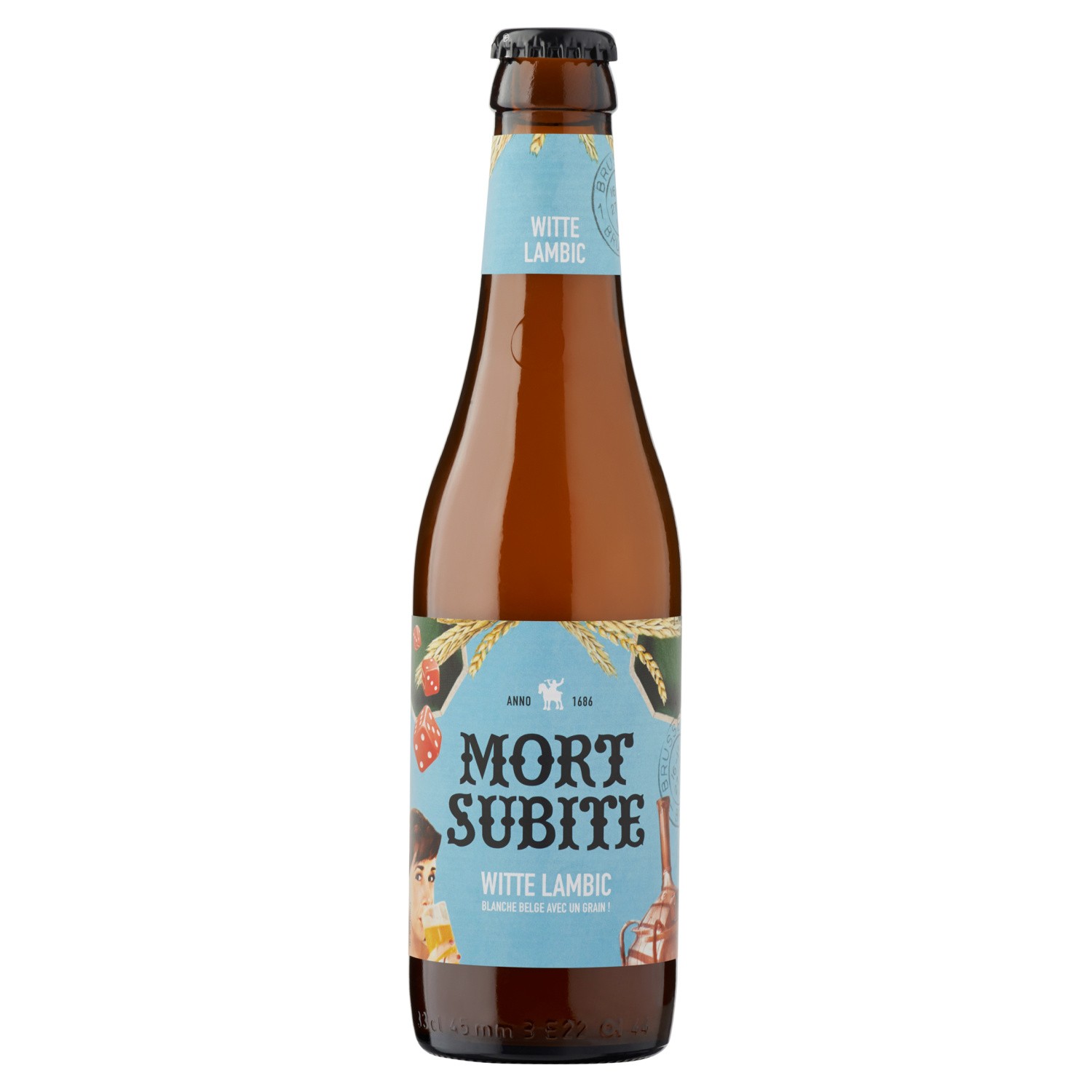 Mort subite Witte lambic. Ingrédients : eau, malt d'_orge_, _blé_, sucre, arôme de fruit, houblon, extraits de houblon. Quantité : g