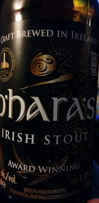Cerveza Artesana Stout O'hara's 4,3%. Ingrédients : omenastown, Co. Carlow, Ireland/Irska. www ralents water,barley malt, wheat, hops, yeas rge blé houblon,levure, Ingredienti acqua, malto d...