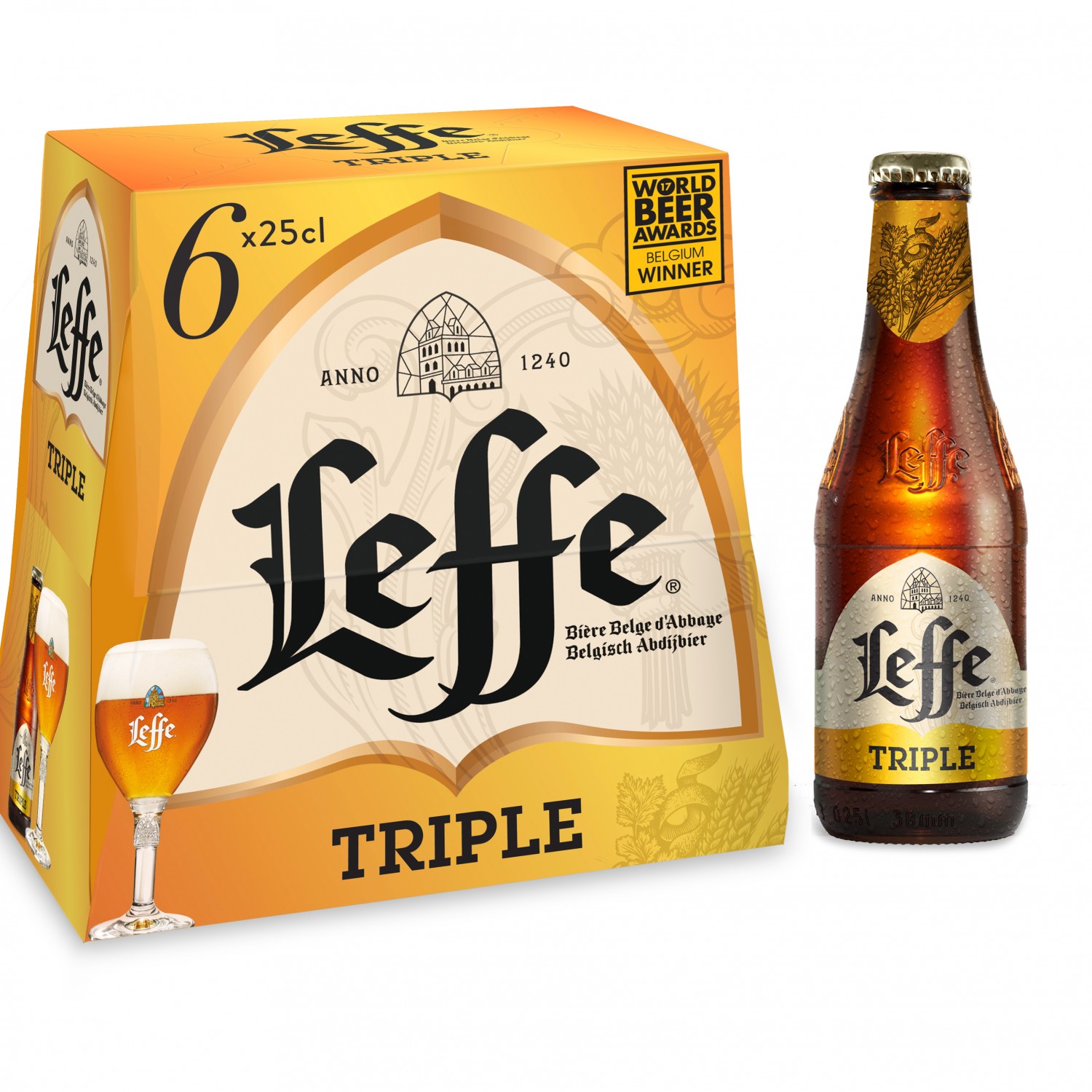 Leffe Triple. Ingrédients : Eau, malt d'_orge_, sucre épices: zeste d'orange et graines de coriandre, houblon. Quantité : 1,5 L / (6 * 25 cl...